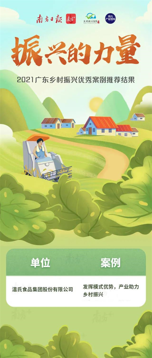 11月25日,由南方报业传媒集团主办的“振兴的力量——2021广东乡村振兴优秀案例推介活动”评选结果正式出炉,温氏股份“发挥模式优势,产业助力乡村振兴”案例上榜。