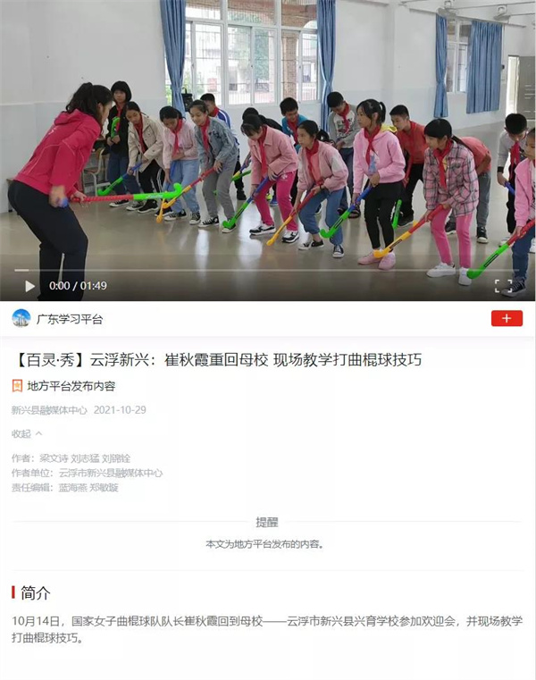 【百灵·秀】云浮新兴:崔秋霞重回母校 现场教学打曲棍球技巧