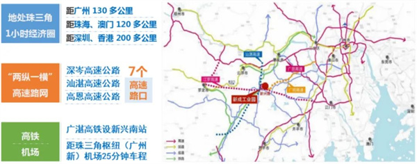 佛山顺德(云浮新兴新成)产业转移工业园处于粤港澳大湾区“1小时经济圈”内。园区基础设施完善,交通便捷,供水、供电、供气以及污水处理、通讯、住宅、公园、学校等配套设施一应俱全;连接湾区和粤西地区的广湛高铁已于2019年底动工,途经云浮将设置新兴南站;园区距离云浮市出入境货运车检场15公里,三茂铁路新兴火车站货运专列直达深圳盐田港。园区所在的新兴县拥有多所名校、上规模的医疗机构、多个大型城市综合体,一批著名景点及大型酒店,汽运、货运、物流、快递、房地产、信息服务等公共配套齐全。