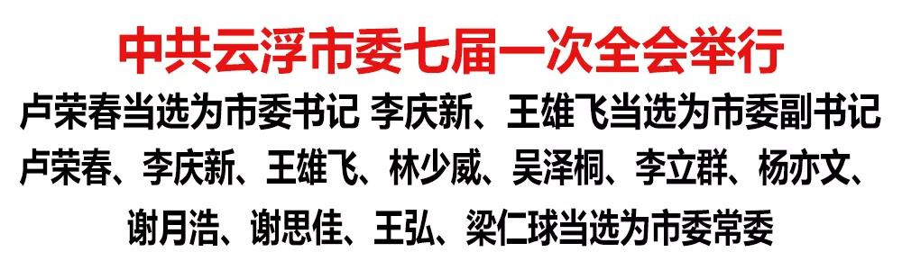 全会选举产生了中国共产党云浮市第七届委员会常务委员会委员和书记、副书记。卢荣春、李庆新、王雄飞、林少威、吴泽桐、李立群、杨亦文、谢月浩、谢思佳、王弘、梁仁球当选为市委常委,卢荣春当选为市委书记,李庆新、王雄飞当选为市委副书记。