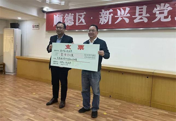 期间,顺德区委区政府向新兴县人民政府致赠100万元支票用于支持新兴县乡村振兴工作。