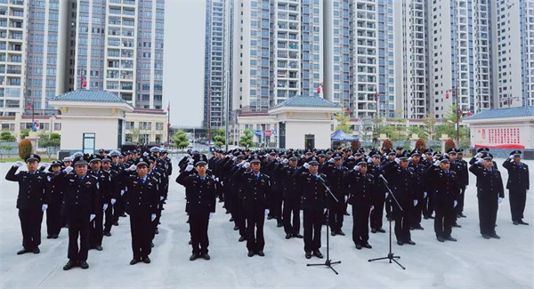 早上10点整,庄严神圣的中华人民共和国国歌响彻会场,新兴公安升警旗仪式正式拉开序幕。伴随着刚劲豪迈的《中国人民警察警歌》旋律,全体人员注目敬礼,高唱警歌,警旗冉冉升起。会场民警身着警礼服,高举右拳,面向警旗庄严宣誓。铮铮誓言响彻云霄,彰显了新兴公安对党忠诚、服务人民、执法公正、纪律严明的政治本色。
