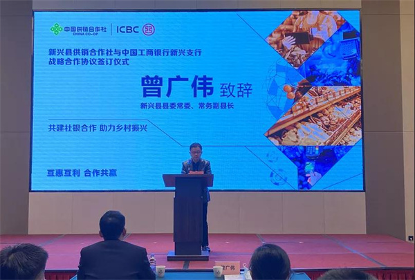 曾广伟指出,乡村振兴是一项复杂的系统工程,除了党委政府的强力推动,还需要社会各界积极参与、共同发力。县供销社在全省供销社系统中思路和做法一直走在前列,2021年以来紧抓公共型农业社会化服务试点改革机遇,以生产、供销、信用“三位一体”综合化作为主线,大力实施“联农扩面、服务提质、运行增效”综合改革行动,不断适应现代农业发展和城乡居民生活需要,立足衔接农产品生产、流通、金融三个环节,促进农业增效、农民增收,在疫情防控、新兴融资高质量发展,实现县域、镇域经济双轮驱动中发挥积极作用。工商银行是国有大行,一直以来将金融支持乡村振兴作为重点工程,从融资支持、绿色金融、数字金融、让利惠农等多方面服务乡村振兴。这次新兴县供销社和工商银行强强联合,形成战略合作伙伴深入推动乡村振兴工作,是社银合作的新典范,希望双方能够资源互补、合作共赢,为我县的乡村振兴工作探索新路子、提供新动能。