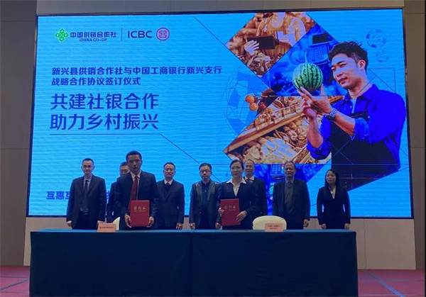 1月11日上午,县供销社与工商银行举行“共建社银合作,助力乡村振兴”战略合作协议签订仪式,携手探索生产、供销、信用“三位一体”综合合作,创新服务“三农”工作模式,促进农业增效、农民增收,更好服务我县乡村振兴。县委常委、常务副县长曾广伟,中国工商银行云浮分行行长李小聪,市、县供销合作社,中国工商银行新兴分行有关负责人等参加仪式。