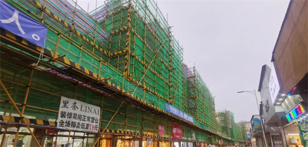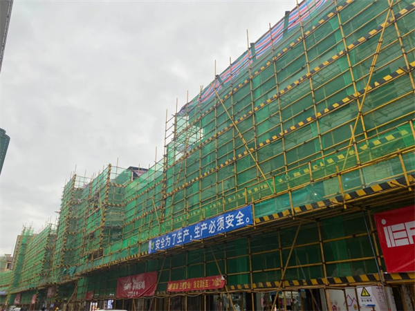 4月3日,记者来到县城解放路,只见沿街的店面外围搭起了脚手架,脚手架外围满挂绿色密目安全网,安全施工警示标识清晰明显。在安全网内的围蔽区域里,工人们正忙碌着进行结构的加固和外墙抹灰等施工作业。