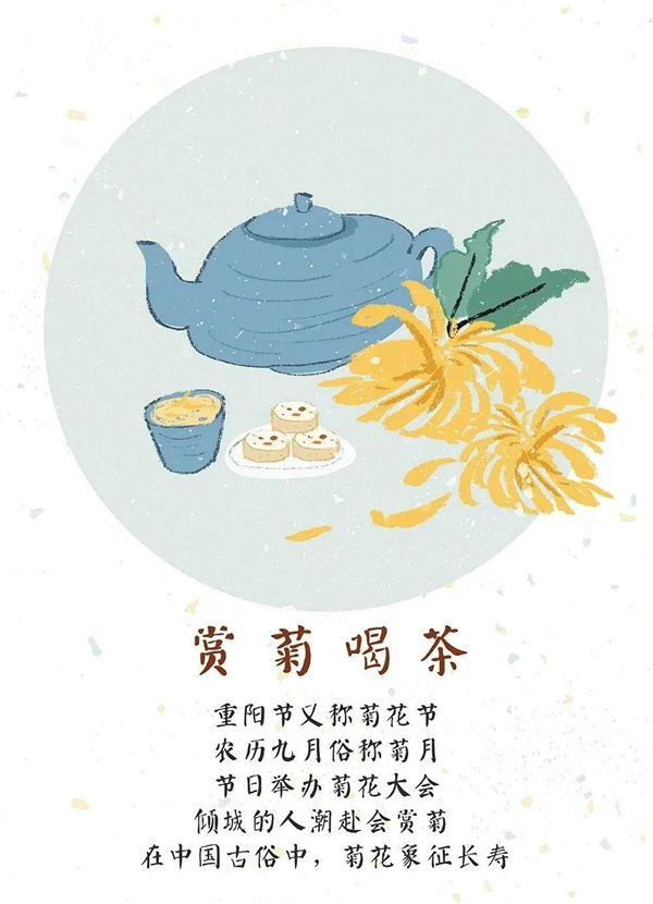 重阳节正是一年的金秋时节,菊花盛开,据传赏菊及饮菊花酒,起源于晋朝大诗人陶渊明。陶渊明以隐居出名,以诗出名,以酒出名,也以爱菊出名;后人效之,遂有重阳赏菊之俗。旧时文人士大夫,还将赏菊与宴饮结合,以求和陶渊明更接近。北宋京师开封,重阳赏菊之风盛行,当时的菊花就有很多品种,千姿百态。民间还把农历九月称为“菊月”,在菊花傲霜怒放的重阳节里,观赏菊花成了节日的一项重要内容。清代以后,赏菊之习尤为昌盛,且不限于九月九日,但仍然是重阳节前后最为繁盛。
