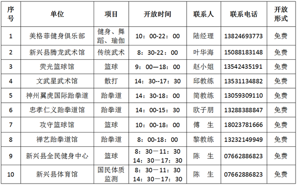 据了解,本次免费向市民开放的10个健身运动场馆包括新兴县全民健身中心、新兴县体育馆、美格菲健身俱乐部、新兴县腾龙武术馆、荧光篮球馆、文武星武术馆、神州翼虎国际跆拳道、忠孝仁义跆拳道馆、攻守篮球馆、禅艺跆拳道馆。市民可以尽情投身到全民健身活动中,享受运动健身带来的乐趣。