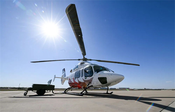 这是2023年4月7日在航空工业天津直升机有限责任公司停机坪拍摄的“吉祥鸟”AC332直升机。新华社记者 孙凡越 摄
