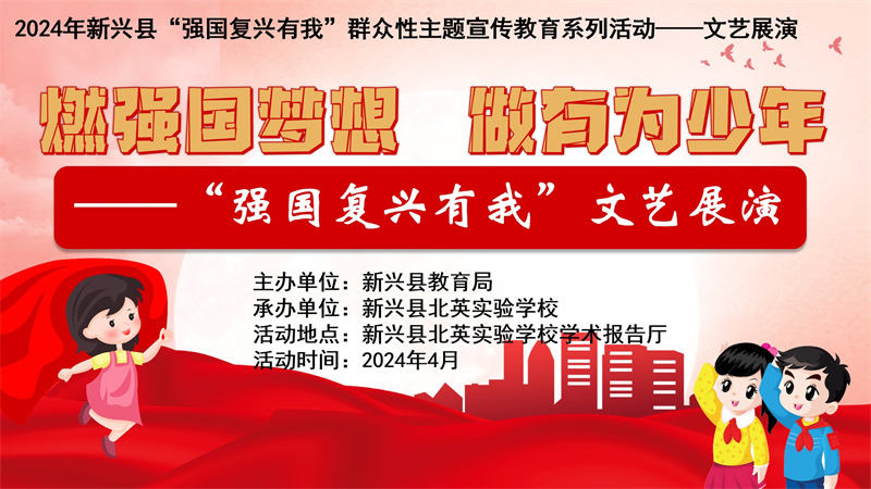 4月22日,由新兴县教育局组织的“强国复兴有我”群众性主题宣传教育系列活动--“燃强国梦想 做有为少年”文艺展演在新兴县北英实验学校学术报告厅盛大举行。