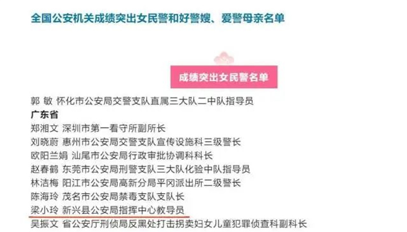 为表扬先进、树立榜样,日前,公安部、全国妇联决定,对全国公安机关200名成绩突出女民警、296名好警嫂、294名爱警母亲予以通报表扬。其中,新兴县公安局指挥中心教导员梁小玲入选“全国公安机关成绩突出女民警”,是云浮市唯一一名入选的民警。