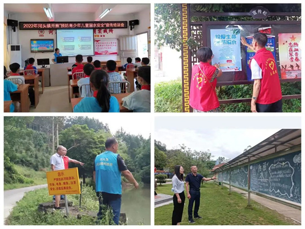明确落脚“点”,确保有效监管。广泛发动社会各界力量,压实各方责任,畅通信息沟通机制,形成以家庭、学校、社会共同参与的“三位一体”防溺水工作监管体系,最大限度消除安全隐患。有效整合河湖长制管理模式,组织网格员开展辖区内河、沟、塘、低洼有水地带安全隐患排查,积极开展劝导劝阻工作,对残旧的警示标志牌和救援设备进行维护,并在危险水域旁放置救生圈、长木棍等救生设备。据各村初步统计,2022年河头镇累计在各村(居)委、重点水域、沟塘边悬挂防溺水宣传横幅18条,张贴宣传海报38张,加装安全警示标牌43块,切实遏制溺水意外事故的发生。