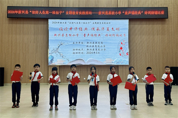 为了引导同学们扣好人生第一粒扣子,更好地弘扬中华优秀传统文化,陶冶学生的艺术情操,提升学生的诗歌朗诵水平和语文素养,丰富学生的课余生活,营造朝气蓬勃、积极向上的校园文化氛围,新兴县惠能小学于2024年5月16日组织二年级学生举办了“童声诵经典”诗词朗诵比赛。