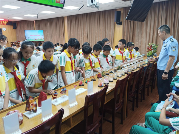 活动最后,庞警官向同学们展示了毒品仿真模型,包括K粉、摇头丸、冰毒等新型毒品的实物模型。通过近距离观察和触摸,学生们对毒品的外观和特征有了更直观的认识,进一步增强了他们的防毒意识。