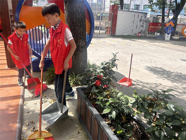 “弯腰拾垃圾,动手护环境”,小志愿者们手持扫帚、垃圾袋等工具,对校园道路、绿化带、操场等区域进行全面清扫。经过大家的努力,校园环境焕然一新,充分展现了新时代少年爱护环境、乐于奉献的良好风貌。