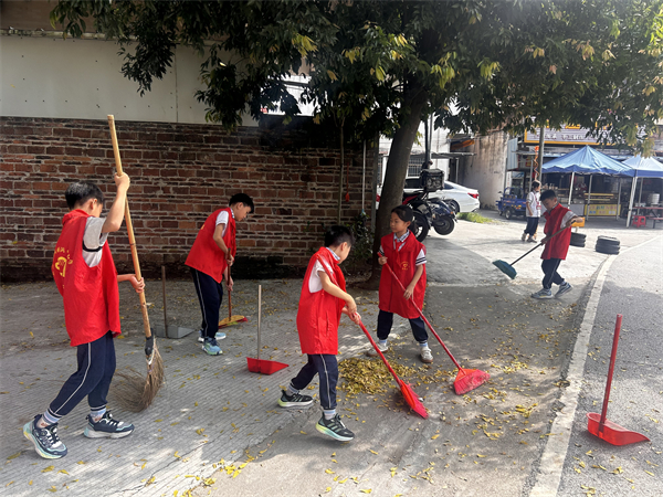 走出校园,小志愿者们来到洞口圩镇街道开展清洁志愿服务。他们手持清洁工具,分工清理街道两侧的生活垃圾、落叶等杂物。 志愿者们的辛勤付出赢得了居民们的纷纷点赞,用实际行动为建设美丽圩镇贡献了校园力量。
