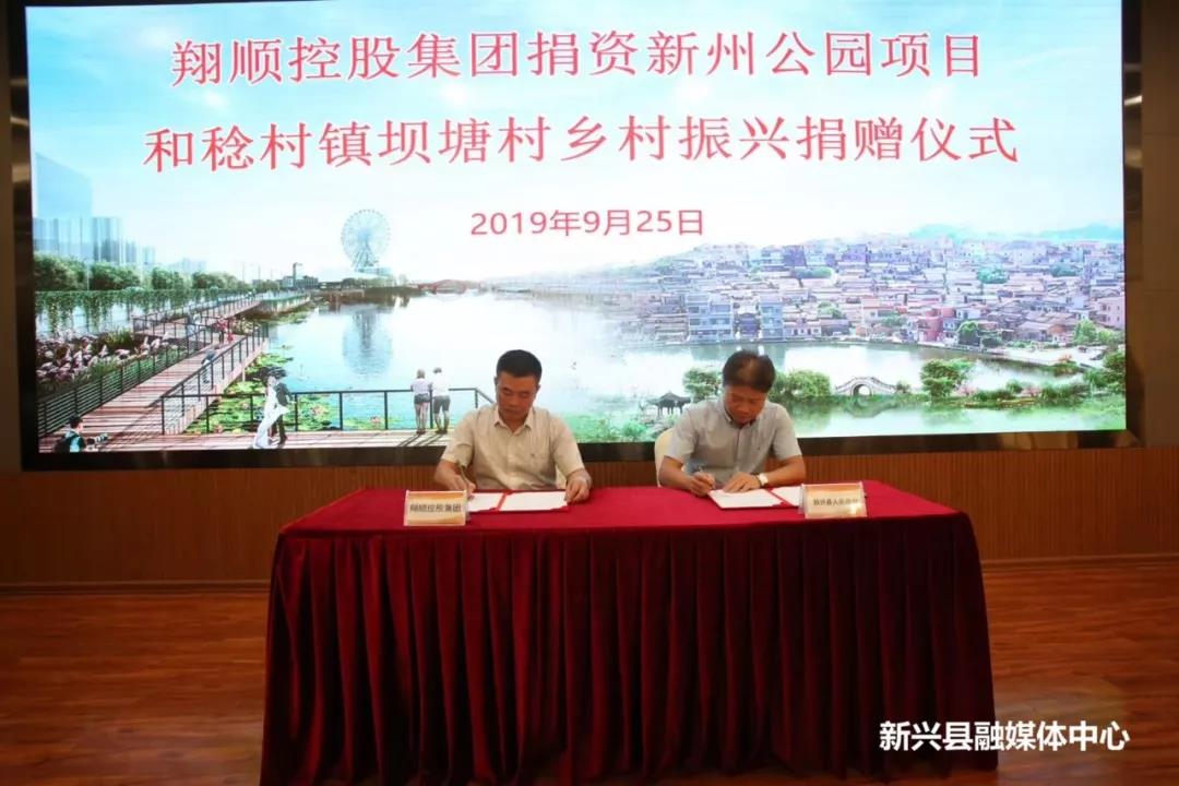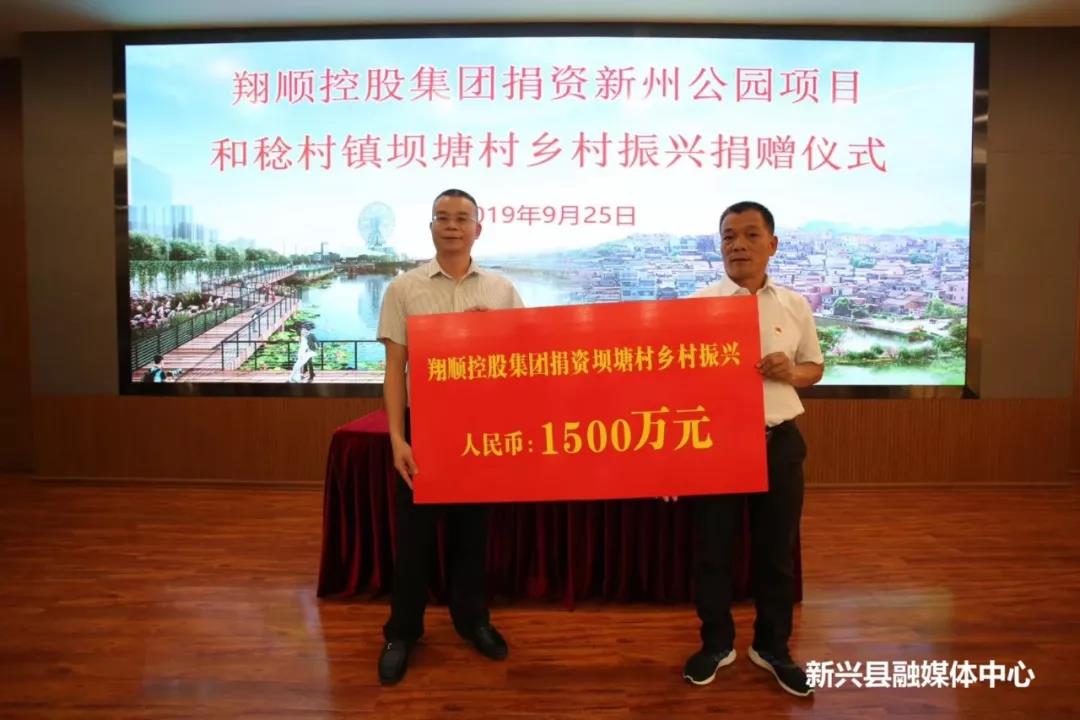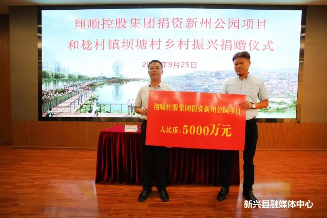 当前,我县乡村振兴和城市扩容提质系列工作正如火如荼推进,为进一步助力我县乡村振兴及城市和谐发展,打造更美家园,翔顺控股集团捐资5000万元支持新州公园项目建设,捐资1500万元支持稔村镇坝塘村乡村振兴,9月25日上午,我县在翔顺集团总部举行捐赠仪式。