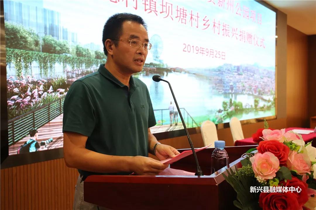 仪式上,县委书记唐谊代表县委县政府向翔顺控股集团热心公益、回报社会的善行义举表示衷心的感谢。他指出,翔顺控股集团一直都大力支持我县的市政建设、敬老助困、兴学重教等民生事业建设和乡村振兴工作,在先后捐资建设了稔村兴育学校、翔顺实验学校、翔顺育才学校等项目基础上,今天又捐资6500万元支持新州公园项目建设和坝塘村乡村振兴,充分展现出成功企业热心公益事业、主动担当社会责任的良好风范,为全社会作出了表率、树立了榜样、传递了正能量,必将影响和带动更多的企业加入到善行义举中,不断增强新兴人民的幸福感和获得感。希望通过此举,打造我县又一市政休闲娱乐的好去处,营造和谐舒适的宜居环境,进一步提升新兴美丽形象;为我县乡村振兴工作添砖加瓦,加快美丽乡村步伐。