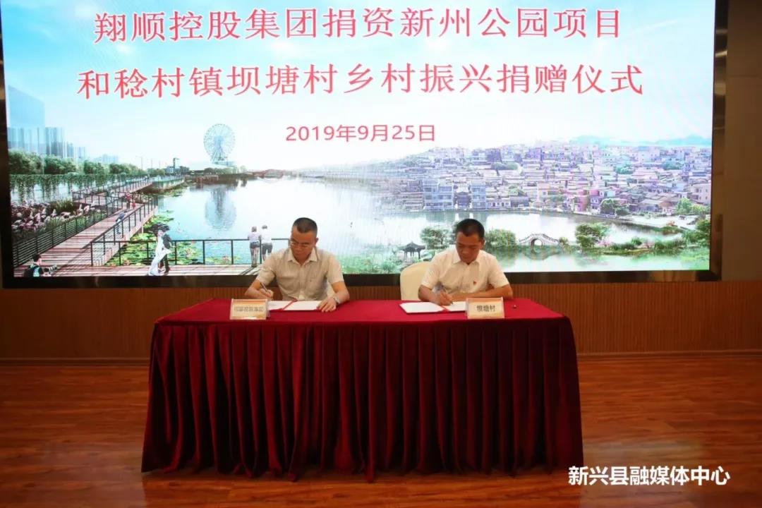 △稔村镇坝塘村有关负责人与翔顺控股集团有关负责人签订《捐资稔村镇坝塘村乡村振兴协议书》。