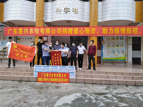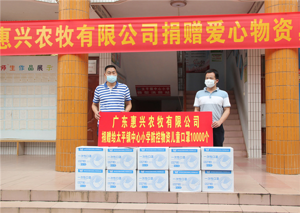 仪式上,郑汉斌代表广东惠兴农牧有限公司向太平镇中心小学捐赠10000个儿童口罩,太平镇中心小学校长简卓锋代表学校接受捐赠。随后,简卓锋代表学校向广东惠兴农牧有限公司回赠锦旗,郑汉斌代表该公司接受锦旗。