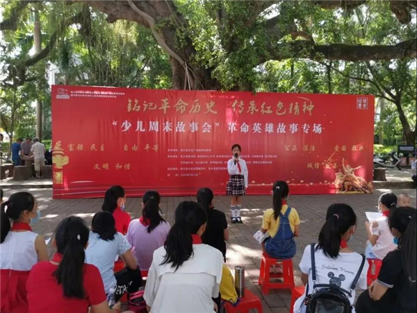 7月11日上午,新兴县2020年未成年人思想道德建设活动之“少儿周末故事会”革命英雄故事专场在新兴县图书馆大门口大榕树底下举办。