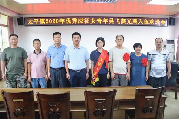 谁说女子不如男,巾帼亦能胜须眉。9月18日下午,太平镇为2020年光荣入伍的女兵吴飞燕举行入伍欢送会。镇委委员、武装部长霍铭锋率镇武装部成员、民兵营长、新兵及家属参加欢送会。