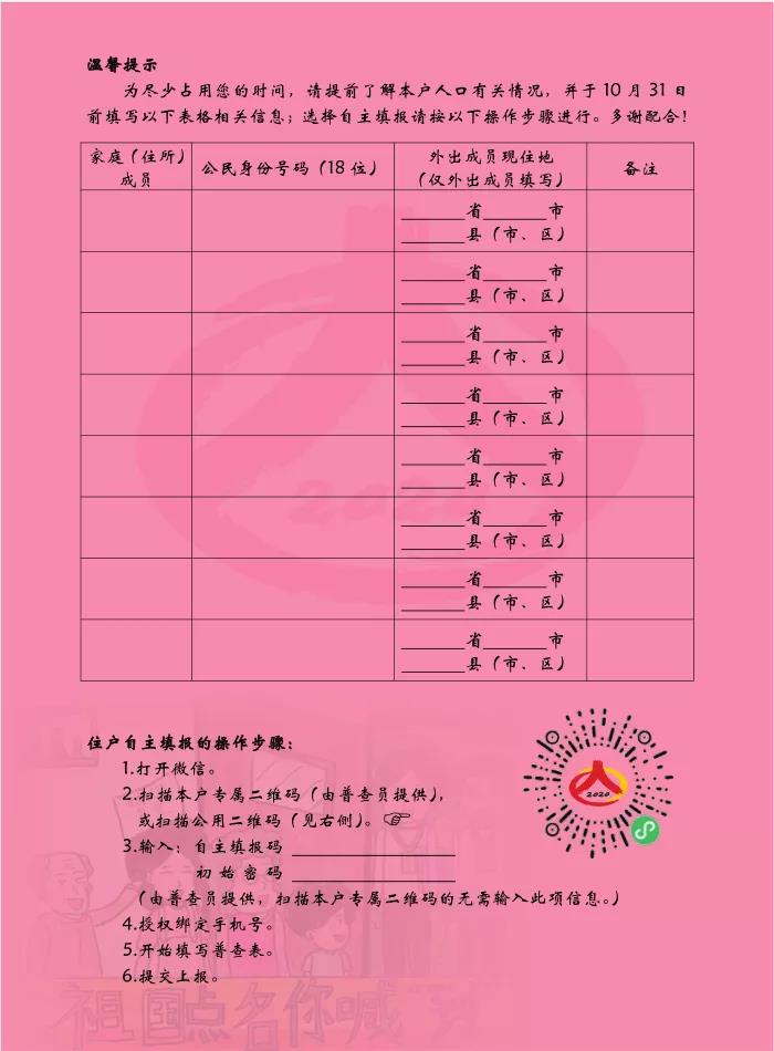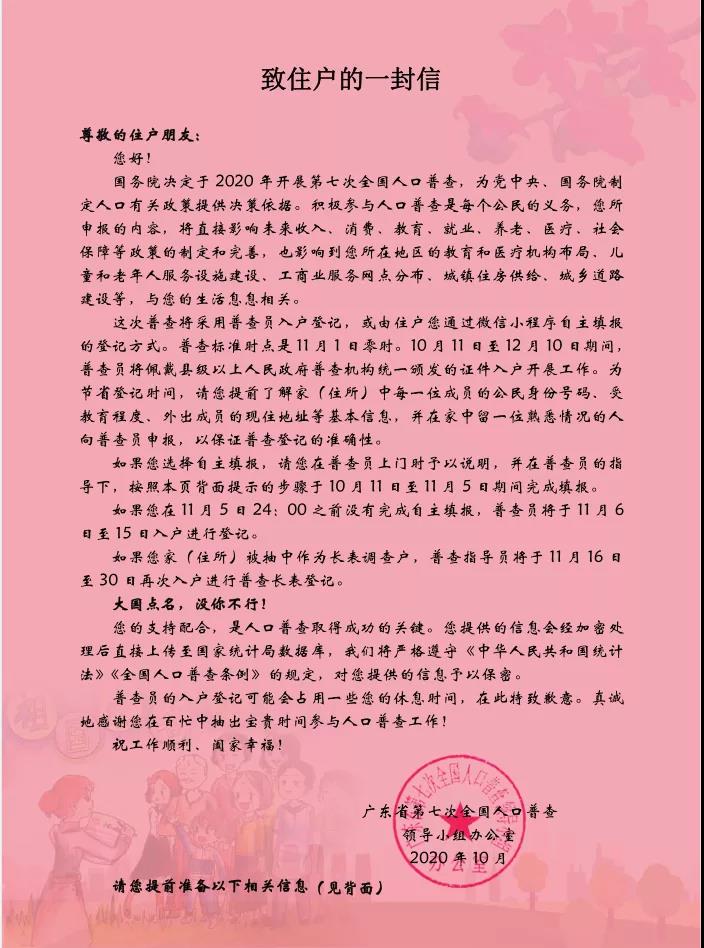 国务院决定于2020年开展第七次全国人口普查。这是中国特色社会主义进入新时代后的第一次重大国情国力调查,关系国计民生、涉及千家万户,需要全县广大党员及干部职工的大力支持和积极配合。普查标准时点是2020年11月1日零时,全县普查员将于2020年10月11日至12月10日入户开展普查工作。为此,特发出如下倡议: