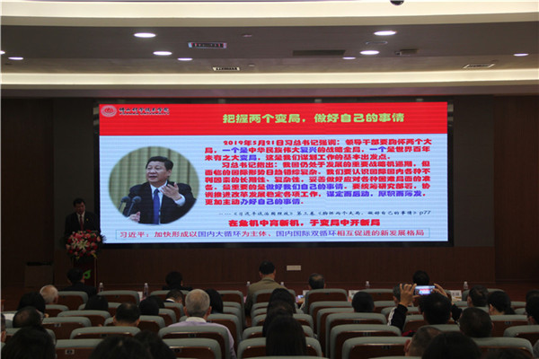 宣讲过程中,曾教授紧紧围绕习总书记提出的关于“两个大局”的重要论述,结合国内国际形势,从“聚焦坚持和加强党的全面领导、聚焦增强忧患意识,防范化解风险挑战、聚焦科技创新、坚持以人民为中心、聚焦两个大局,做好自己的事情”五个方面进行了精彩的论述。