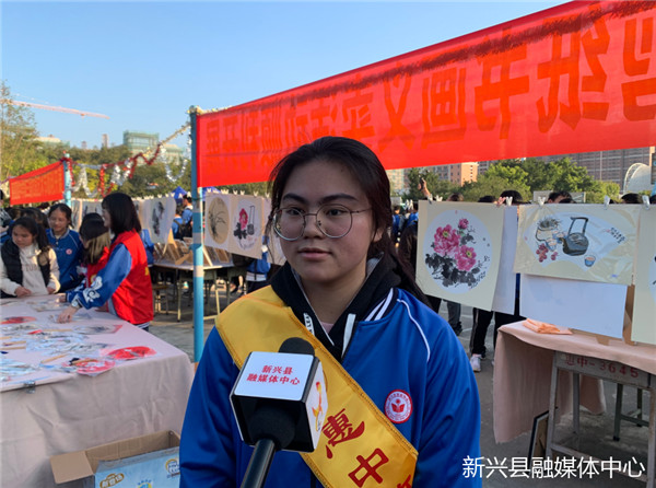 陈贵华(县惠能中学团委副书记):"今天是我校第三届剪纸书画义卖活动,这个活动是我们学校师生一起参与的,这些善款主要用作支助贫困学生的生活费,通过这次活动我们不仅仅可以让学生能够热爱生活,还能够让他们有一种乐善好施的品质。"