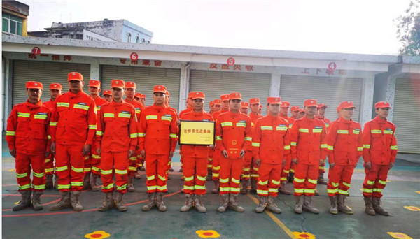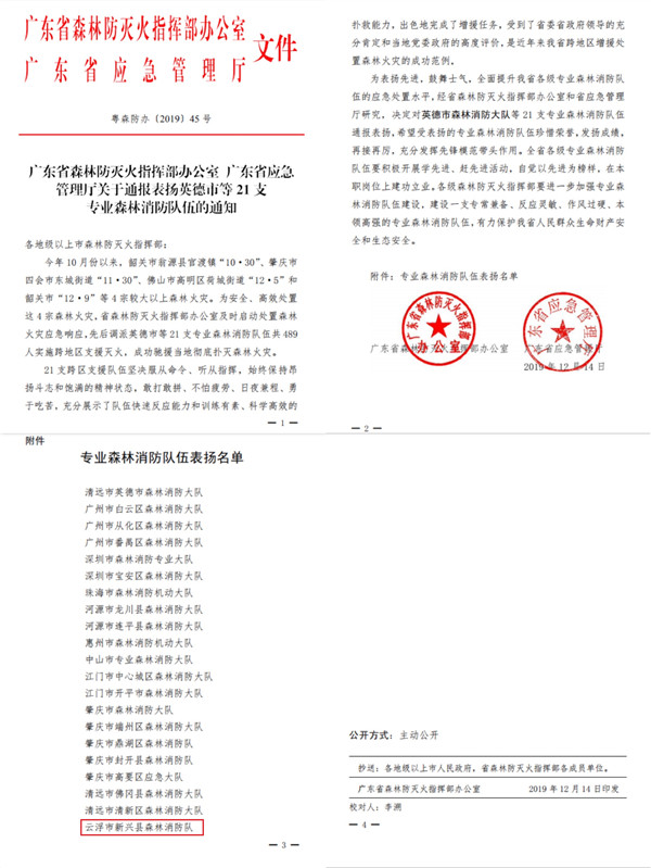 2019 年 12 月 7 日,接到上级紧急命令,县森林消防队组织 30 余名扑火队员奔赴阳春市增援扑火。在应急管理局副局长叶海东和森林消防队副队长余计祥、李西廷的带领下向火场急速开进。在2 天一夜的战斗中,面对一次次危险,队员们沉着应对;在参战的队员在火场密切的配合、科学的扑打、精悍的技术令熊熊燃烧的烈火望而生畏,一点一点地渐渐缩退,森林慢慢恢复了往日的平静。县森防队奔赴阳春市增援扑火的行为,在省森林防灭火指挥部办公室、省应急管理厅联合发文《广东省森林防灭火指挥部办公室、广东省应急管理厅关于通报表扬英德市等21支专业森林消防队伍的通知》中得到通报表扬。