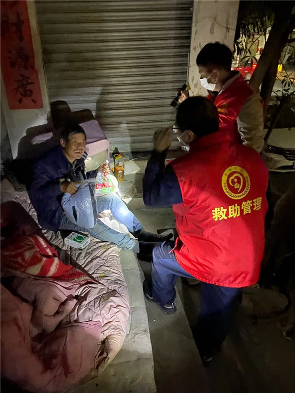 目前,昼夜温差较大,对流浪乞讨人员的生命安全造成了极大的威胁,新兴县救助站加强夜间巡查救助工作,携带着御寒物资,走上街头、仔细“寻人”, 通过向流浪者宣传救助政策,耐心劝导其到救助管理站接受救助;对于拒绝到救助站接受救助的人,救助站工作人员便为其送去棉被、大衣、食物、药品、医用口罩等御寒保障物资,并给予其温馨提示,要加强常态化的疫情防控工作,到人多的地方一定要戴上口罩,保护好自己。