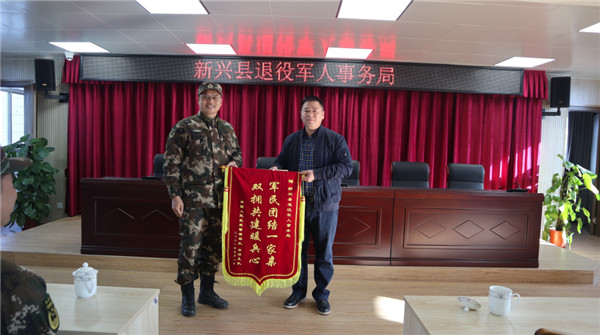 1月12日下午,武装云浮支队相关领导一行5人来到县退役军人事务局,分别向我局赠送了写有“军民团结一家亲,双拥共建暖兵心”的锦旗和一封感谢信,感谢我局一直以来对部队发展建设和官兵身心健康的支持和保障。