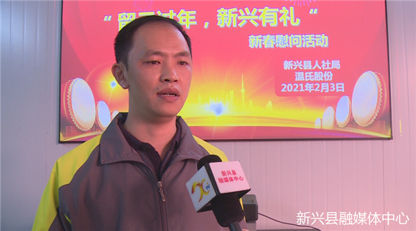 吴洪明(翔顺餐厨具有限公司外来务工人员):“我是外来人员四川的,到新兴已经有20多年了,为了响应政府的号召,留在新兴过年,今天也受到政府和温氏集团对我们外地员工的慰问,非常感谢政府和温氏集团对外地员工的关心。”