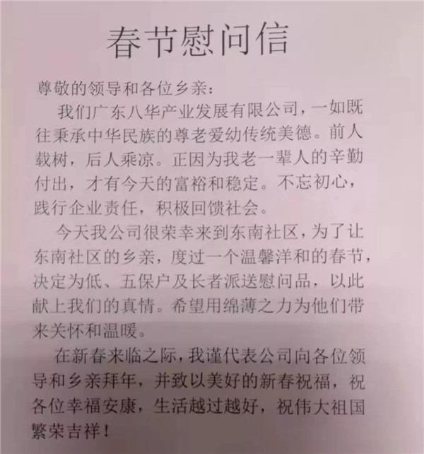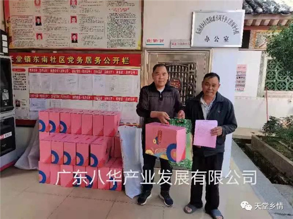 2021年春节前,天堂镇东南社区暖意融融,该社区过百名长者和低保、五保户都收到了来自广东八华产业发展有限公司派发的春节慰问品和节日的祝福。