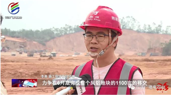 李勇:“东园一期我们场地平整大概1500亩,其中凤铝用地1100亩,我们现在看到的地方以前都是一片山地,我们进场以来,日夜加班投入了大量的施工机械,力争在6月底完成整个凤铝地块的1100亩的移交。”