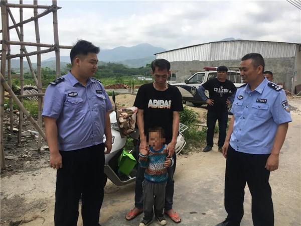 3月20日上午10时许,有群众报警称:在稔村镇坝塘村发现一名疑似走失的三岁小男孩,请派人到场处理。稔村派出所接报后,教导员区红波马上带队出警,到达现场后发现该小男孩并不会说出自己的父母姓名和住址,且使用移动警务终端也不能确认其身份。民警立即通过联系村委干部进行调查走访,历时两小时,终于找到小男孩的父亲。当民警将小男孩交回到其父亲手中时,小男孩的父亲对稔村派出所民警、辅警的热心帮助表示衷心感谢,旁观群众亦纷纷点赞。