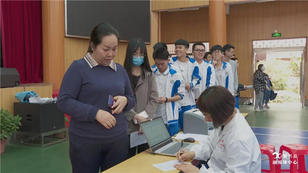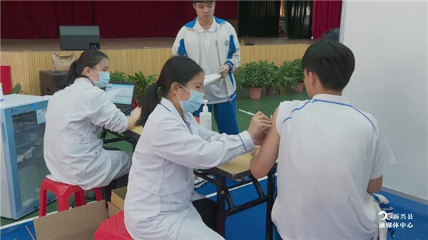 在新兴一中,记者看到医务人员正在为师生注射疫苗,其他等候的人员有序排队等待接种,共有1100余名师生接种疫苗。