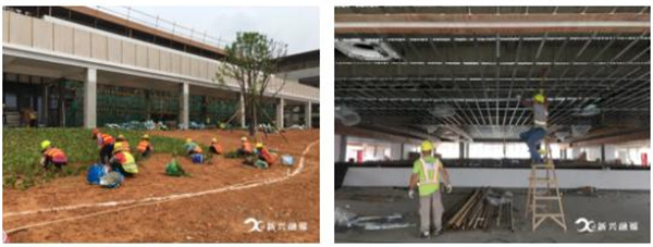 在项目施工现场,可以看到,学院的楼体排栅已经拆除完毕,一座座恢宏大气的崭新大楼展现眼前,十分亮丽。工人们正忙着安装空调、园林绿化种植、道路施工等,各项工作紧锣密鼓地进行中,一派如火如荼的施工场景。