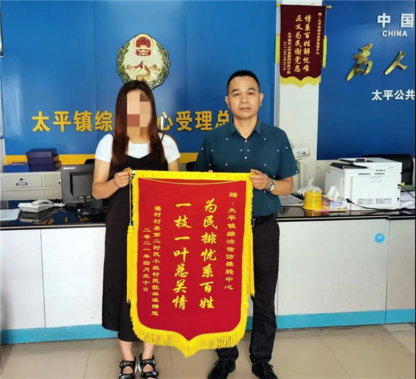 5月10日,太平镇禤村村委下禤村的一名群众张女士走入了太平镇综治中心,满怀感激地赠送了一面写着“为民排忧系百姓,一枝一叶总关情”的锦旗,感谢镇中心为其及时快速解决了一宗邻里纠纷。