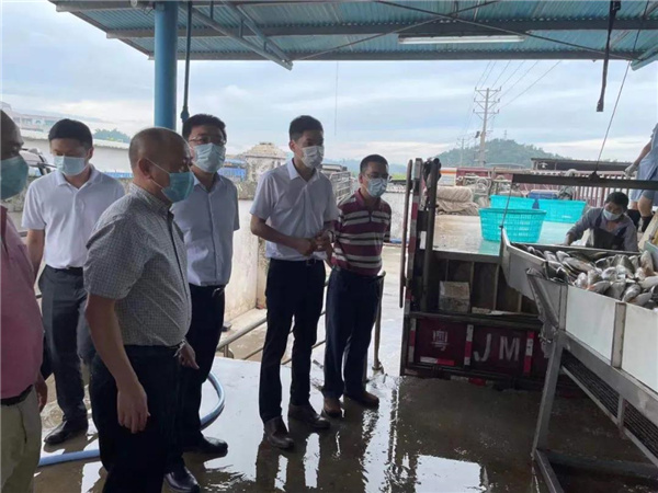 在广东明基水产各生产车间,王巍详细了解该公司渔业生产、水产品加工生产销售情况、企业发展目前存在的问题以及安全设施配备及废水废气无害化处理等情况。