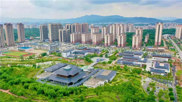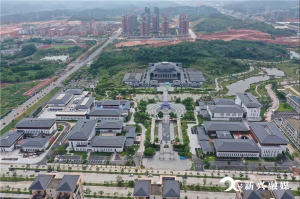 从高处俯瞰,“四馆两中心”主体建筑群古色古香,空间分隔脉络清晰,气势恢宏。该项目采用“新唐风”建筑风格,在中国传统建筑文化中寻找现代的演绎方式,将建筑融于山水间,追求简洁、抽象、意境,承载了新兴地区独特的传统文化与新时代内涵。整体利用层叠递进的东方院落园林空间为市民及游客建构高品质、舒适的人文环境与人居环境,以建筑诠释“以人为本”的人文精神。