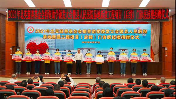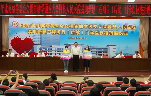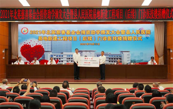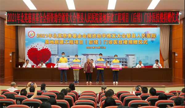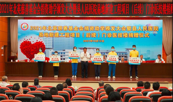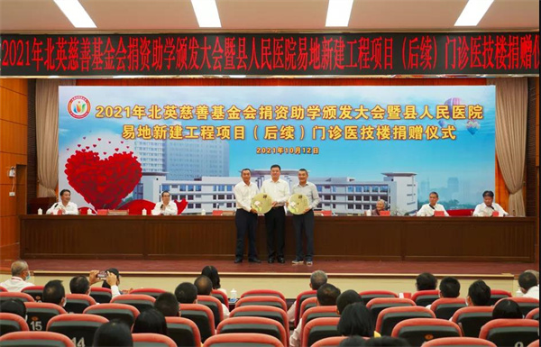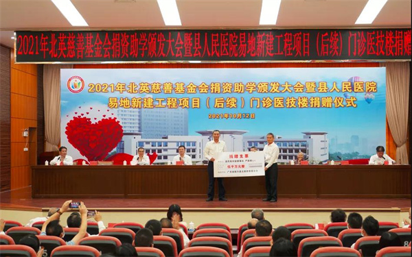 10 月 12 日下午,我县举行 2021 年北英慈善基金会捐资助学颁发大会暨县人民医院易地新建工程项目 (后续)门诊医技楼捐赠仪式。北英慈善基金会捐资1亿元建设县人民医院新院门诊医技楼,并奖励扶助430名学生179.9万元,县委书记王巍,县委副书记、县长陈哲江以及北英慈善基金会永远荣誉会长梁焕珍、温氏股份董事长温志芬、温氏股份名誉董事长温鹏程等出席仪式。