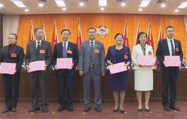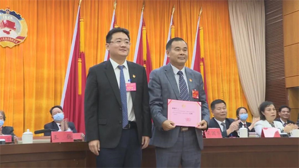 县委书记王巍为新当选的县政协主席梁国华颁发当选证书;县政协主席梁国华分别为新当选的县政协副主席陈敏、陈丽兴、陈启雄、苏子汉、陈丽明、汤健平颁发当选证书,为新当选的县政协秘书长和县政协常务委员颁发当选证书。