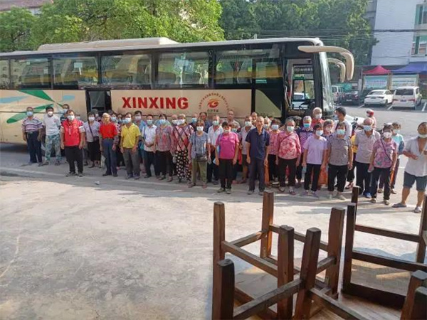石龙岗村干部组织村里的老人到卫生院打新冠疫苗并安排大巴车接送