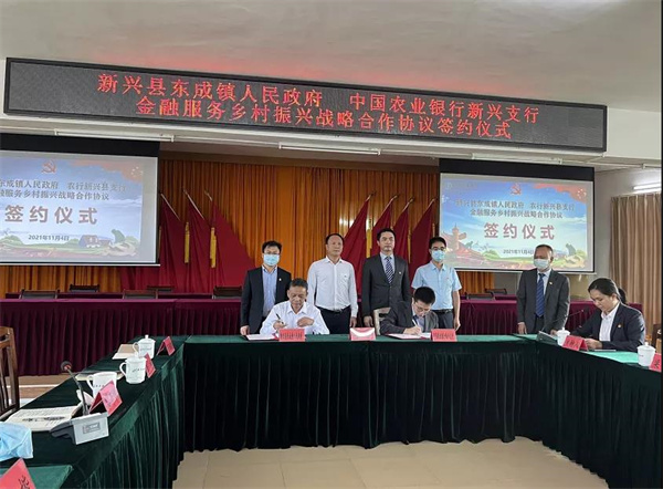 11月4日上午,在顺德区驻新兴县东成镇工作队牵线搭桥下,东成镇政府与农业银行新兴县支行举行“金融服务乡村振兴战略合作协议”签订仪式暨“乡村振兴金融服务点”授匾活动,合力共推镇村金融服务,全面推进乡村振兴,实现互利共赢。