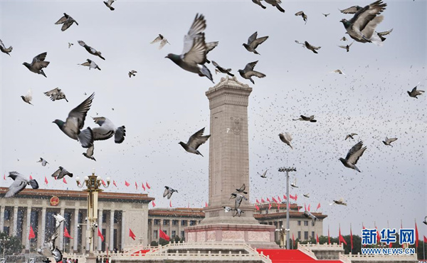 7月1日上午,庆祝中国共产党成立100周年大会在北京天安门广场隆重举行。这是庆祝大会现场和平鸽展翅高飞。新华社记者 孙非摄