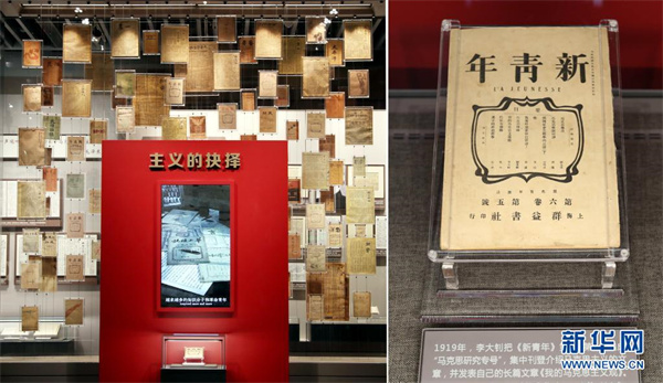 这是6月1日在上海的中共一大纪念馆拍摄的大型立体式视觉置景“主义的抉择”,100件五四运动前后传播马克思主义、社会主义的报纸杂志,错落陈列在玻璃墙上。其中,《新青年》第6卷第5号“马克思研究专号”在前端“高光”展示,这期“专号”标志着马克思主义在中国的传播进入了较为系统的阶段。新华社记者刘颖 摄