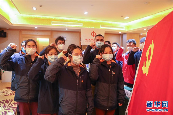 广州中山大学附属第一医院驰援武汉医疗队火线入党的新党员在武汉汉口医院宣誓(2020年3月2日摄)。新华社发