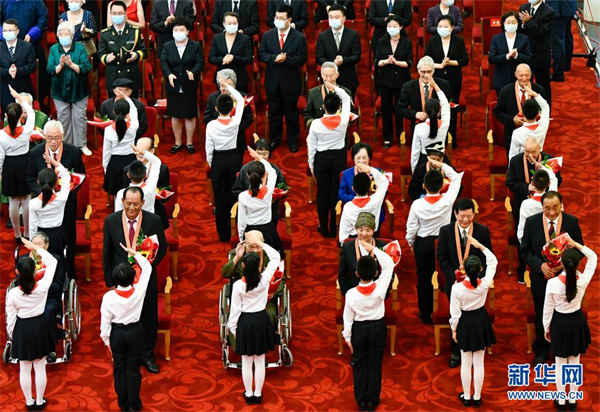 6月29日,庆祝中国共产党成立100周年“七一勋章”颁授仪式在北京人民大会堂金色大厅隆重举行。这是少先队员向勋章获得者献花,敬礼致意。新华社记者高洁 摄