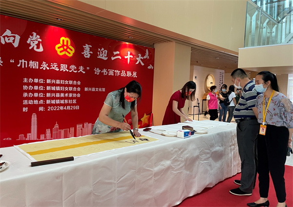为迎接党的二十大胜利召开,4月29日上午,县妇联在新城镇城东社区举办“巾帼心向党 喜迎二十大”诗书画作品联展。