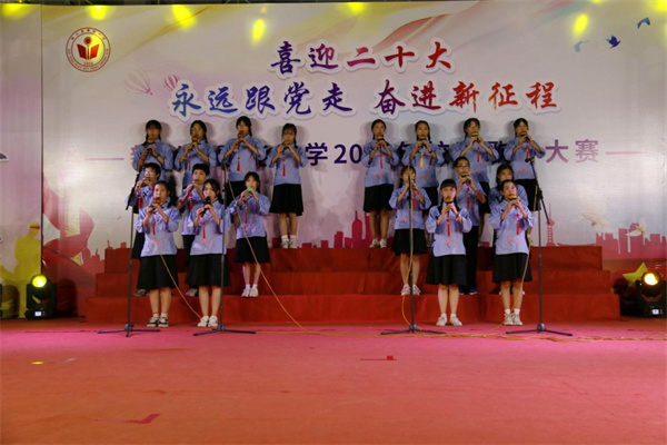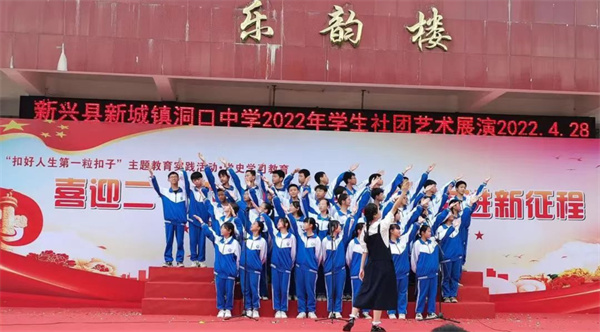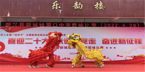 近日,新城镇洞口中学举行了“喜迎二十大、永远跟党走、奋进新征程”主题歌咏比赛。参赛班级演唱了《没有共产党就没有新中国》《中国,中国,鲜红的太阳永不落》《歌唱祖国》等经典的曲目,整齐嘹亮的歌声,唱响了热爱祖国的主旋律,弘扬中华民族的伟大精神。活动中,学校醒狮社团还为师生们送上精彩表演。